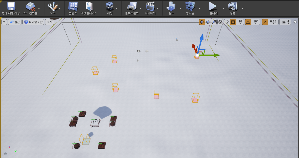 좀비 타입의 SpawnPoint 액터 근처에서 부활< SpawnPoint 액터들 (경비타입 - 녹색, 좀비타입 - 적색) >