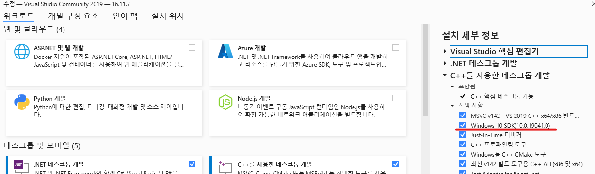 4. WinSDK 와 Visual C++ Build Tools 2019